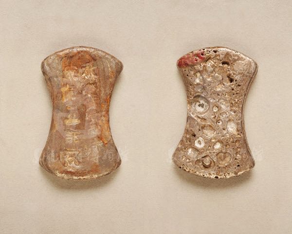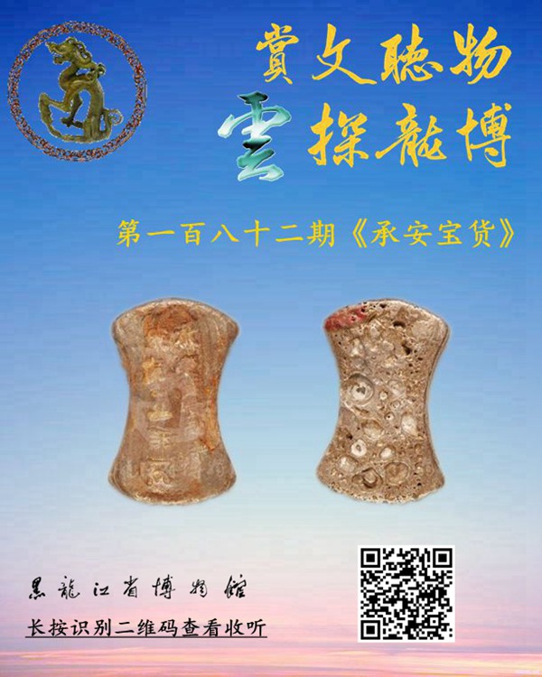 受唐宋文化影响,金代承安宝货银币也承袭了唐宋时期的银铤形制。黑龙江省博物馆所藏的这枚承安宝货银币,是1982年黑龙江省人民银行在黑龙江省西部地区收集到的5枚银币之一。其束腰,正面较平,长4.8厘米,最宽处3.0厘米,束腰处宽2.1厘米,厚0.55厘米,重58.8克。首端中部横凿汉字楷书“承安”;腰部竖凿汉字楷书和押记,右为“宝货壹两半”,系此银币的币值,也是其实际重量,左为“库□”“部□”,分别是金朝所设货币管理机构交钞库的检勘押记及金朝户部的勘复押印,用于防止偷工减料现象的出现;边缘为三道水波纹,背面与侧面有许多凹陷和小孔,呈密集蜂窝状,是浇铸银水时气体溢出而产生的气孔。“承安”为金章宗年号,“宝货”本应与“承安”连凿一起,限于铤面狭小而落行竖凿于腰部,故识读时应连读为“承安宝货”。