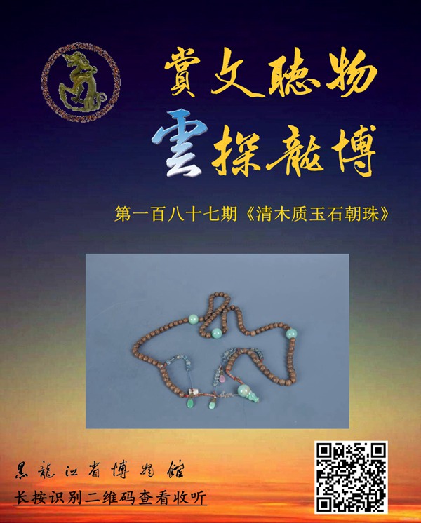 黑龙江省博物馆馆藏的木质玉石朝珠,由108颗木质珠穿成,珠串中穿有翠珠4个,上端翠珠与小翠葫芦相连成佛头塔。朝珠上附有3串玻璃珠组成的纪念,每串纪念分别有10颗珠及1个坠角。