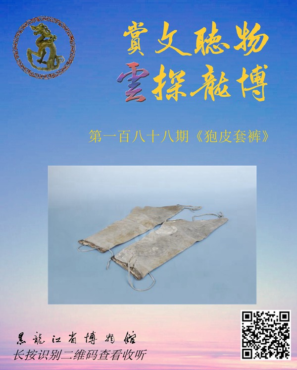 这件狍皮套裤为黑河市爱辉区新生鄂伦春乡征集而来,现藏于黑龙江省博物馆。它长84厘米、宽35厘米,鄂伦春语称“阿木苏”,是“两只不相连的半截裤腿”的意思。狍皮套裤用夏季的狍皮制作,一般用1至2张狍皮制成,制作2至3天,能穿1年以上。狍皮套裤上边为斜口,前长后短,上下缀有皮绳,穿时上端皮绳系在腰间,下端皮绳系在靴靿上,冬季可保护靴鞋不进雪。在套裤上容易折破的地方通常都饰有绣花或贴花,起到增加保护和美感的双重效果。皮套裤具有轻巧、耐磨、防寒、防潮等优点,深受北方游猎民族喜爱。