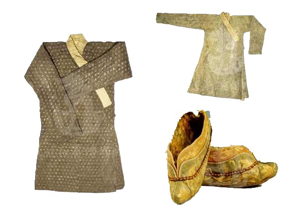 完颜晏在金代地位尊贵,从他墓葬中出土的30多件用料精美、做工考究的最高阶层贵族丝织服饰和冠带便可看出。在男性墓主人身上的棕褐团花绣大口裤,采用素绢面料缝制而成,在腰背开口处有三对系带,裤脚上扣有脚蹬套带,被专家称为“八百年前的脚蹬裤”,其样式非常适合女真族骑马活动。紫地云鹤纹织金锦棉袍着于女性墓主人身体的最外层,绛紫色的衬里质地为绢,里面絮着丝棉。棉袍使用了织金面料,“双鹤飞翔”图案配以灵芝形的云朵,营造出仙境般的氛围。