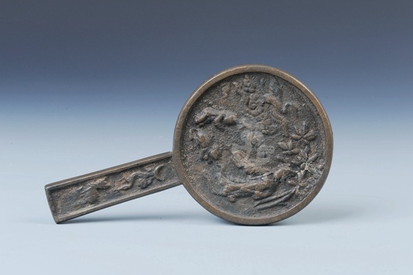 仙人故事镜又称仙人指路镜、母子戏犬镜、仙女兽鹤镜等,这件“山东官□”款带柄仙人故事镜出土于黑龙江省穆棱市,现藏于黑龙江省博物馆。它圆形,有柄,边缘内斜,柄为凹槽式,通长15.1厘米、柄长6.8厘米、直径8.4厘米、缘厚0.5厘米。镜背上部仙鹤飞翔,祥云盘绕,树叶低垂。一仙女头挽髻,着飘逸长裙,手持一物,对面一童子双手伸出呈接物状,底有小动物抬头观望。柄背面流云托月,一头牛回首望月,正面刻有“山东”、“官”字和押记。据《金史》记载,金朝设山东东路和山东西路。二路大致管辖今山东省地区,此镜经山东一路官府检验,押记是检验官的标记(也有学者认为是“匠”的异体字),以纤细清晰的字体契刻官府验记和押记,是金代铜镜的另一个重要特征。