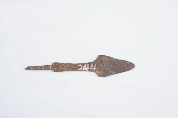 从发掘出土的铁器看,渤海的军事装备颇显精熟,这件铁镞,便是渤海时期的军事用具之一,现藏于黑龙江省博物馆。黑龙江省博物馆所藏铁镞的数量较多,尺寸长在7厘米至17厘米之间,宽在0.8厘米至3.6厘米之间,形制也分,很多种,有铲形铁镞、凿形铁镞、棱形铁镞等。
