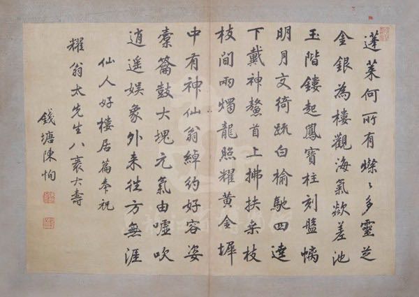 这件耀翁寿辰祝诗册,清,绫本,17开,每开纵26.5厘米、横38.0厘米,现藏于黑龙江省博物馆。