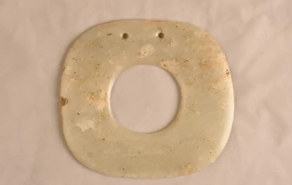 黑龙江省博物馆馆藏的这件玉璧,方形而圆角,器缘略有残缺,长15.9厘米、宽14.4厘米、孔径6.4厘米、厚0.8厘米。璧内外缘磨薄,一边有双孔,孔间距3.2厘米。孔系对钻而成,有移动痕迹。器身正面微凸并打磨光滑,背面较为平整。通体素面无纹饰,因此可称素面玉璧。其色黄绿中泛白,且有白色絮状物和稀疏的黑点。透明度虽不高,其温润的玉质却让人爱不释手。这件玉璧的玉料系岫岩透闪石玉,是目前为止我国发现的同类形状中最大的玉璧。其年代距今约5000年,造型是典型的红山文化玉璧。