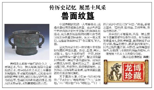 这件黑龙江省博物馆馆藏的兽面纹簋,折沿,直腹,圈足,双鋬耳。鋬耳上部均饰有一兽首,圈足下方还增饰有一圈“台阶”。腹上部及圈足均饰有一圈宽平条带型纹饰。纹饰以云雷纹为地纹、兽面纹为主干。兽面纹面部凸显,目纹突出,显得炯炯有神。从其形制、纹饰等特点来看,这件兽面纹簋的年代当是商代晚期。