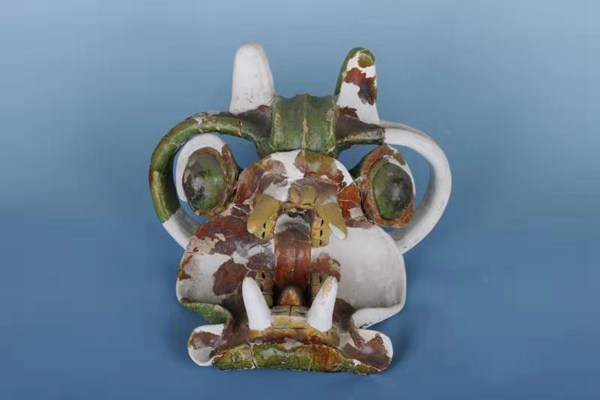 此兽头三彩,陶质,手工塑成,长49厘米、宽42厘米、高36厘米,现藏于黑龙江省博物馆。兽头张口露齿,上下颌各有犬齿和门齿二枚,口内上下各有臼齿二枚;卷舌,舌齿均施黄釉;两眼圆睁暴出,施紫釉,眼皮施绿釉;朝天鼻,鼻形似牛,施绿釉;兽头后部两端各竖一耳;脑后可见竖鬃三条,通体施绿釉;底部形如板瓦,凹面向下;自鼻至底有一孔,竖穿一铁条,系固定之用。