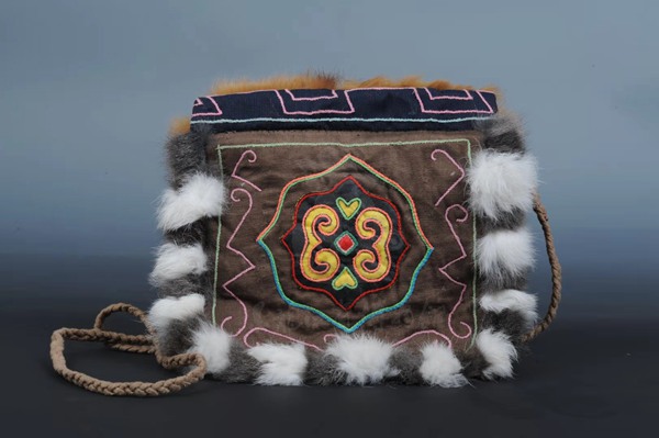 这件鄂伦春族毛皮包,长26厘米、宽26厘米,为黑河市爱辉区新生鄂伦春乡征集,现收藏于黑龙江省博物馆。鄂伦春语称其为“窟地”,是一种专门用来盛装妇女贵重物品的毛皮口袋,多为姑娘结婚时的嫁妆。毛皮包上的花色、图案非常多,是利用各种动物皮毛的自然色彩巧妙搭配而成的镶嵌制品。其图案错落有致,色调明快协调;中间部分用五色丝线绣出具有象征性的“团花”、“盘长”、“卷子云”等图案装饰,是颇具狩猎文化特征的民间手工艺品。