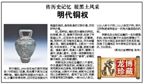 明代铜权,1988年在哈尔滨市阿城县(今阿城区)征集,现收藏于黑龙江省博物馆。铜权是研究我国古代经济、文化、计量的珍贵实物,可佐证我国古代衡器发展史,具有极高的文物价值与历史研究价值。