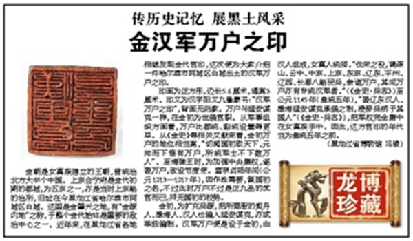 金初,为扩充兵源,把所降服的契丹人、渤海人、汉人也编入猛安谋克,亦或单独编制。汉军万户便是设于金初,由汉人组成,女真人统领。《金史·兵志》载道,“伐宋之役,调燕山、云中、中京、上京、东京、辽东、平州、辽西、长春八路民兵,隶诸万户,其间万户亦有专统汉军者。”至1145年(皇统五年),“罢辽东汉人、渤海猛安谋克承袭之制,浸移兵柄于其国人”(《金史·兵志》),把军权完全集中在女真族手中。因此,这方官印的年代当为皇统五年之前。