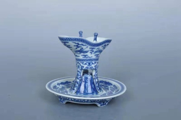 青花云鹤爵盘,清乾隆,爵杯口径4.8厘米×11.6厘米,足距4.6厘米,托盘口径14厘米,足径9.8厘米,通高13.4厘米。爵杯在造型上仿照三代青铜器式样,扁长圆口,有尾有流,深腹,下腹弧收,小平底,下鼎立三外撇锥形足。爵杯口沿左右两侧朝天出柱形双耳,柱顶为圆球形,腹部一侧有一螭(chī)形鋬(pàn)。外壁以青花满绘纹饰,口沿及腹间绘三角几何纹为界栏,其间绘青花云鹤纹,祥云缭绕,仙鹤翩跹(piān xiān),腹部界栏下方和尖足处以缠枝花卉纹装饰;爵杯下有托盘,托盘圆形,折口板沿,浅弧腹,中间有凸起的山形爵座,爵座上有三条凹槽,用以插三足,盘底浅圈足,其下具四垂云足。盘内爵座上绘寿桃纹和海水江崖纹,周围内壁上绘云鹤纹,口沿绘一周三角几何纹,外壁饰四组折枝花卉纹,四垂云足饰缠枝花卉纹,爵杯底部和托盘底部书青花“乾隆年制”双行四字篆书方款。