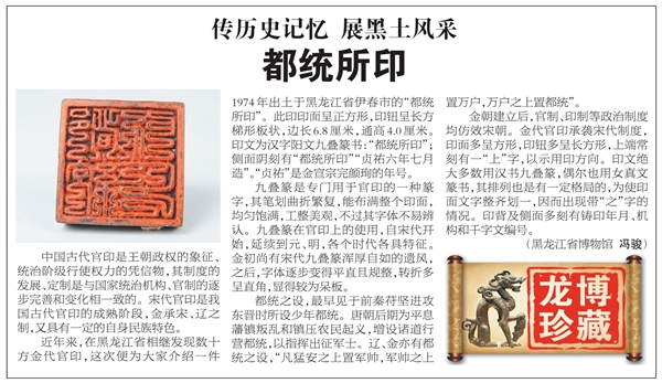 近年来,在黑龙江省内相继发现数十方金代官印,这方于1974年在黑龙江省伊春市出土的“都统所印”就是其中一方。此印印面呈正方形,印纽呈长方梯形板状,边长6.8厘米、通高4.0厘米。印文为汉字阳文九叠篆书“都统所印”;侧面阴刻有“都统所印”、“贞祐六年七月造”。“贞祐”是金宣宗完颜珣的年号。
