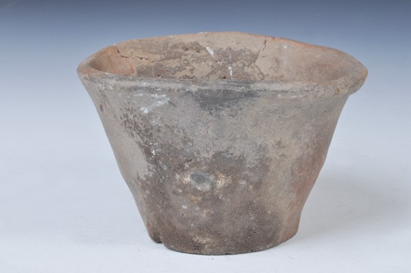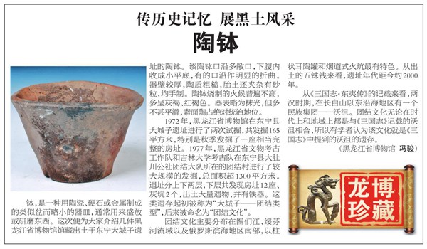 钵,是一种用陶瓷、硬石或金属制成的类似盆而略小的器皿,通常用来盛放或研磨东西。这件现藏于黑龙江省博物馆的陶钵,出土于东宁大城子遗址。黑龙江省博物馆所收藏的陶钵口沿多敞口,下腹内收成小平底,有的口沿作明显的折曲;器壁较厚,陶质粗糙,胎土还夹杂有砂粒,均手制;其烧制的火候普遍不高,多呈灰褐、红褐色;器表略为抹光,但多不甚平滑,素面陶占绝对统治地位。