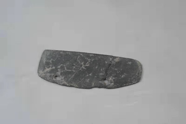 双孔石刀于1964年5月出土于黑龙江省宁安市东康遗址。石刀长12.7厘米、宽4.5厘米、厚0.4厘米,为灰色页岩磨制而成,呈长方形,刀背平直略,两端略有弧度,刀刃近半月状,稍残缺;截面扁平,靠刃部有两个圆孔,用来穿绳固定之用。