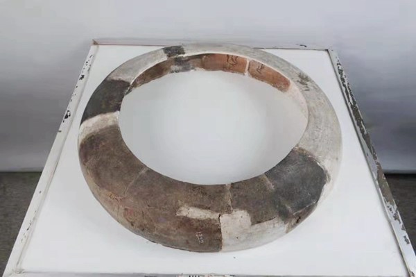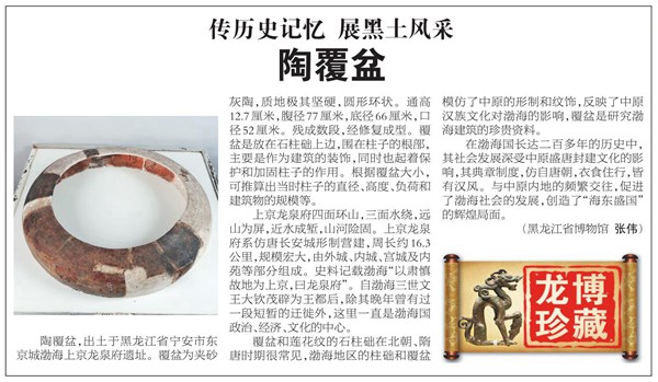 这件陶覆盆,出土于黑龙江省宁安市东京城渤海上京龙泉府遗址,现收藏于黑龙江省博物馆。覆盆为夹砂灰陶,质地极其坚硬,呈圆形环状。它通高12.7厘米、腹径77.0厘米、底径66.0厘米,口径52.0厘米。其出土时残成数段,后修复成型。覆盆是放在石柱础上边,围在柱子的根部,主要是作为建筑的装饰,同时也起着保护和加固柱子的作用。根据覆盆大小,可推算出当时柱子的直径、高度、负荷和建筑物的规模等。