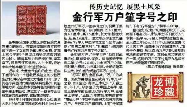 近年来,大量金代官印的出土,证实了当时作为一个游牧民族建立的少数民族政权,得以在中国北方雄踞119年,除了其在冷兵器时代拥有的骑兵优势外,统治策略方面,在坚持本民族特色的同时并借鉴中原王朝经验,建立起了一整套符合自身发展的统治制度,包括官印制度。