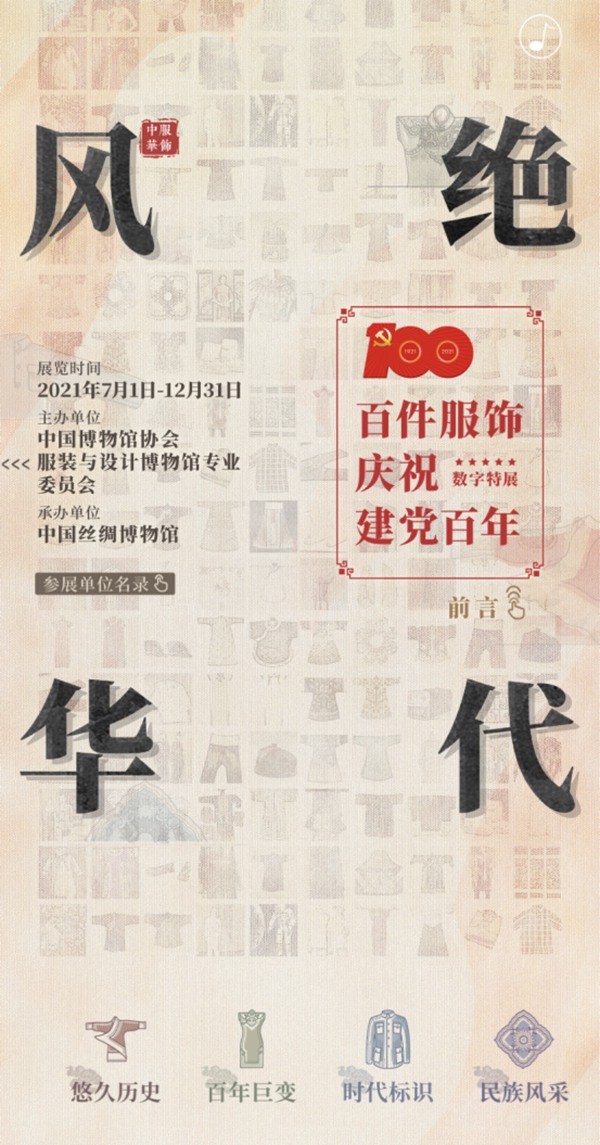 该展览由中国博协服装与设计博物馆专委会主办,中国丝绸博物馆承办,为庆祝中国共产党成立100周年,服设专委会从全国50余家团体会员中遴选了百余件服饰藏品,从“悠久历史”、“百年巨变”、“时代标识”、“民族风采”四个部分,以虚拟数字展形式,梳理中华传统服饰文化更迭发展的源流与韵味,同时也向世人传播中华上下五千年服饰文化的故事与魅力。