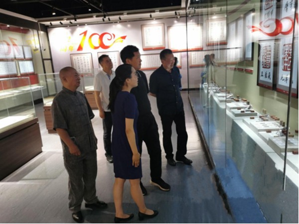 参观过程中,朱会长一行不时驻足,仔细观看红色经典《中国共产党百年文献百卷文钞》、红色丰碑《中国共产党百年人物百人印存》、红色诗篇《中国共产党百年先烈百首诗钞》、红色理论《习近平同志治国理政百论精要》等展览内容,通过一幅幅精美书法篆刻作品,感受伟大的中国共产党波澜壮阔的百年历程。