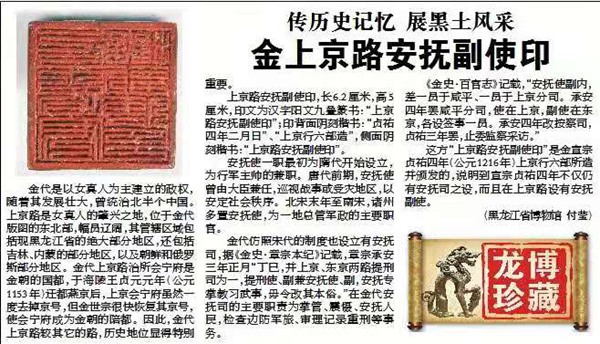 这方“上京路安抚副使印”是金宣宗贞祐四年(公元1216年)上京行六部所造并颁发的,说明到宣宗贞祐四年不仅仍有安抚司之设,而且在上京路设有安抚副使。
