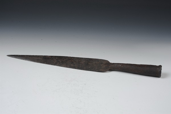 矛的名称很多,在古代被称为矟、槊、鋋、铍等。到后世也被称为枪,是一种尖头直刺的长柄兵器,一直被广泛使用。矛的历史悠久,在新石器时代矛是一种重要的渔猎工具,当时只要将石矛捆绑在木棍上就可以,简单,粗糙,但矛头的形状较为定型,同时也可用骨、陶制成矛头使用;商周时期已经出现了铜矛,制作比较精致;周代铜矛型式有所发展,矛刃部分明显加长,也较为简化;战国铜矛与周代铜矛相近,到秦汉仍然使用铜矛;之后由于铁器的普及,铁矛逐渐取代了铜矛。铁矛前锋更加锐利,长矛缩短,重量明显减轻,便于使用,威力加大,矛身的种类也增多了。矛逐渐发展成为军队中的重要装备,在战争中的作用也更加重要。这类兵器出土数量仅次于铁镞,以刺、冲为主,步兵和骑兵都可使用。