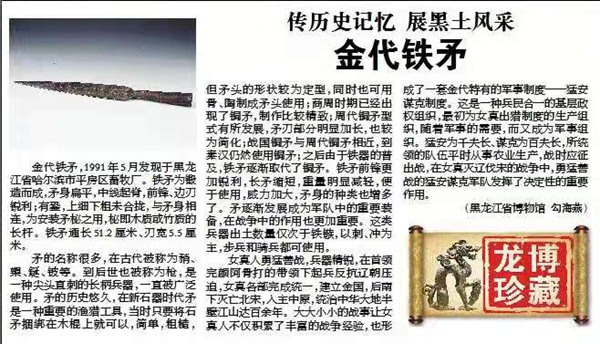 金代铁矛,1991年5月发现于黑龙江省哈尔滨市平房区畜牧厂。铁矛为锻造而成,矛身扁平,中线起脊,前锋、边刃锐利;有銎,上细下粗未合拢,与矛身相连,为安装矛柲之用,柲即木质或竹质的长杆。铁矛通长51.2厘米、刃宽5.5厘米。