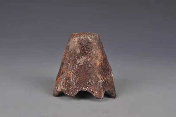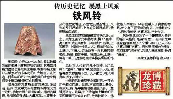 黑龙江省博物馆馆藏文物铁风铃,出土于黑龙江省宁安市渤海镇,横3.5厘米、高8厘米、底径8厘米。风铃铁质,范铸,上顶圆平,中间有一小孔,八边,略向外弧曲,上端小,下端大,边缘各有一形状相同的棱弧,稍残,整体中空。铃摆已失,上端一侧有一乳丁,是渤海国寺庙檐头所挂的饰件。