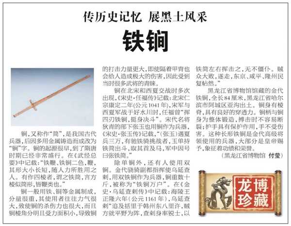黑龙江省博物馆馆藏的金代铁锏,全长84厘米,黑龙江省哈尔滨市阿城区亚沟出土。锏身有棱脊,具有良好的穿透力。锏柄与锏身为整体锻造,搏击时不容易断裂;护手具有保护作用,手不受伤害。这种长形铁锏是金代高级将领使用的兵器,大部分是皇帝赐予,象征着功绩和荣誉。
