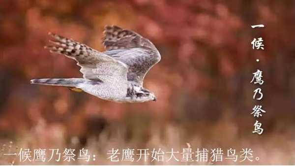 中国古人将处暑分为三候:“一候鹰乃祭鸟;二候天地始肃;三候禾乃登。”此节气中老鹰开始大量捕猎鸟类;天地间万物开始凋零;“禾乃登”的“禾”指的是黍、稷、稻、粱类农作物的总称,“登”即成熟的意思,如“五谷丰登”。