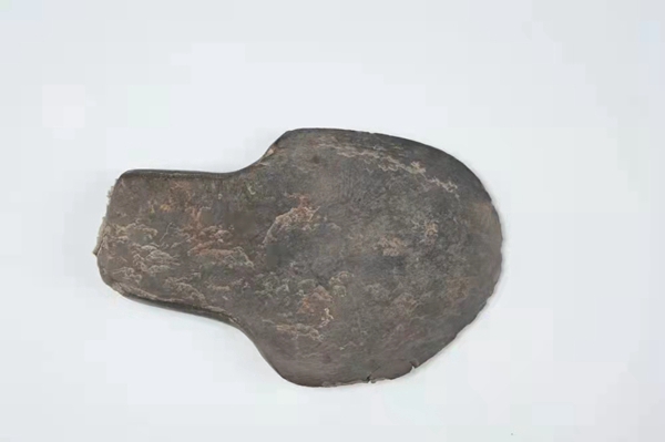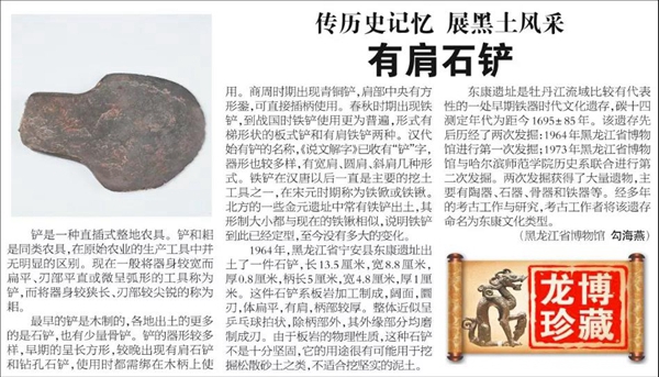 1964年,黑龙江省宁安县东康遗址出土了一件石铲,长13.5厘米,宽8.8厘米,厚0.8厘米,柄长5厘米,宽4.8厘米,厚1厘米。这件石铲系板岩加工制成,阔面,圜刃,体扁平,有肩,柄部较厚。整体近似呈乒乓球拍状,除柄部外,其外缘部分均磨制成刃。由于板岩的物理性质,这种石铲不是十分坚固,它的用途很有可能用于挖掘松散砂土之类,不适合挖坚实的泥土。