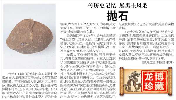 女真人不仅能征善战,而且善于学习,有着极强的进取精神。女真人从汉族学习先进的攻城技术,制作攻城器械,抛石、礌石、云梯、火梯等皆会使用。抛石,黑龙江省齐齐哈尔市甘南县阿荣旗出土,这是古代军事上抛石机(也叫抛车、投石车)所发射的石质卵形弹丸。在火炮发明以前,抛石机是除大型弩机外的唯一具有远距离杀伤力和攻坚能力的重型武器,尤其是对于手工业落后、无法制造弩机的游牧民族,抛石机显得更为重要。这件抛石的出土,证明当时金代黑龙江地区的军队已经在使用抛石机,是研究金代兵器的实物资料。