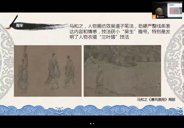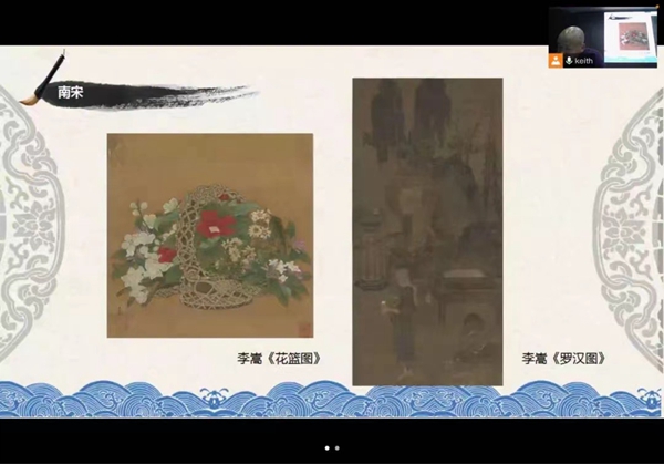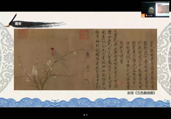 宋代的绘画是中国绘画艺术发展史上的一个高峰。讲座中,蒋老师赏析《五色鹦鹉图》《金明池争标图》等名作。著名的“南宋山水四大家”李唐、刘松年、马远、夏珪和北宋相比有显著变化,着重画山川奇秀一角,善于从广阔大自然中描绘出艺术感染力形象,是很大进步。首推马远、夏珪,开创独特画派,后人称“马夏派”。这对后来的山水画有很深远的影响。