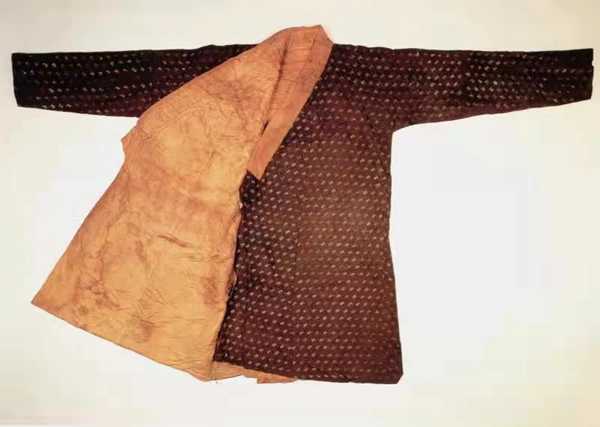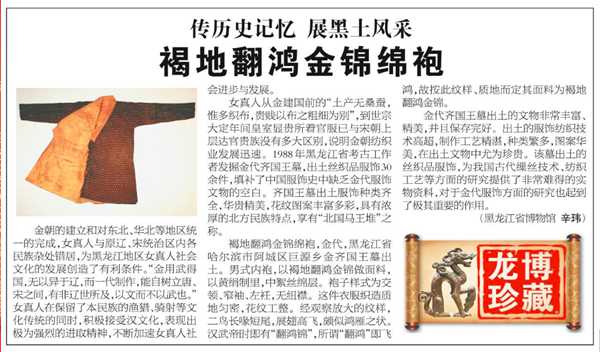 褐地翻鸿金锦绵袍,金代,黑龙江省哈尔滨市阿城区巨源乡金齐国主墓出土。男式内袍,以褐地翻鸿金锦做面料,以黄绢制里,中絮丝绵层。袍子样式为交领、窄袖、左衽,无纽襟。这件衣服织造质地匀密,花纹工整。经观察放大的纹样,二鸟长喙短尾,展翅高飞,颇似鸿雁之状。汉武帝时即有“翻鸿锦”,所谓“翻鸿”即飞鸿,故按此纹样、质地而定其面料为褐地翻鸿金锦。