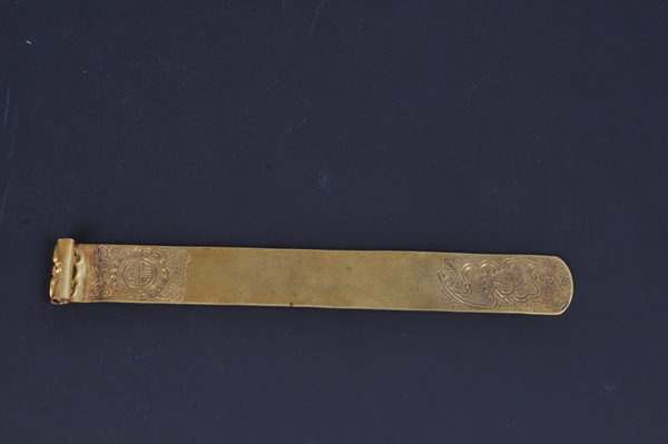 扁金簪长17厘米、宽1.8厘米、厚0.1厘米,重35.57克。簪呈宽扁长方形状,簪头卷成空柱状,表面卧一压花蝙蝠。紧靠尾部的簪身正面有一錾刻宝相花,花心为錾刻团寿字,花四周衬以点状线构成的如意云纹。靠近头部处,有一线刻飞翔的蝙蝠,四周衬以点状线组成的如意云纹。图案整体寓意“福寿如意”。背面两处刻有“足金”二字刻款。此簪做工精细,金质纯正,器表呈暗黄红色。