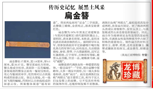 扁金簪为1976年黑龙江省爱辉县(今黑河市爱辉区)清代富明阿墓出土。富明阿,清末著名将领,本姓袁,是明末抗清名将袁崇焕的后人。富明阿早年从军,曾参加清政府平定新疆喀什噶尔叛乱势力的军事行动,因有战功,先后授骁骑校、参领、管带、宁古塔副都统、汉军正红旗都统、江宁将军、吉林将军等职,被赏头品顶戴,官居一品,被赐黄马褂,谥号“威勤”。