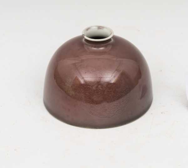 豇豆红釉,因色彩酷似熟透的豇豆皮而得名,康熙年间仿明宣德所烧制的一种高温铜红釉。豇豆红器,一般为器内白釉,器外壁为铜红釉,铜红釉是分几次吹釉,由于吹釉的层次不同,在高温烧成后,釉中必出现水渍般的现象。因受高温影响,豇豆红釉色千变万化,烧成难度很大,制作时间也短,成功率极低,只能由官窑少量生产,专供皇室使用,一般只限于水盂、印盒、笔洗等文房用具,基本无大件器物。