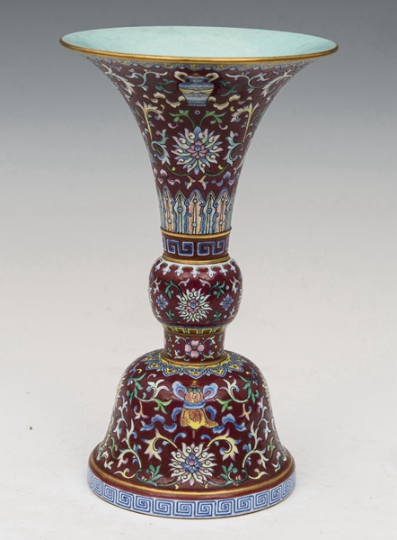 花觚为喇叭状侈口,细长颈,圆鼓腹,束腰,钟形胫,圈足。其器内与底部皆施松石绿釉,外表以胭脂紫为地,主体纹饰八吉祥纹分绘在颈部和胫部。花觚口沿描金,下接如意云头纹;颈部主体图案是番莲托八吉祥纹,其下为蕉叶纹;长颈下端和腹部相接处有描金弦纹两道,其中间部分是半周一描金长方形框,内书“大清乾隆年制”六字单行篆书款和以蓝、白双彩套绘的半周回纹;鼓腹处主体图案绘番莲纹,辅以变形如意云头纹等纹饰;腹部和胫部相接处也有描金弦纹两道,绘花朵图案;胫部从上至下分别为如意云头纹、番莲托八吉祥纹、描金弦纹;圈足处以蓝彩绘一周回纹。