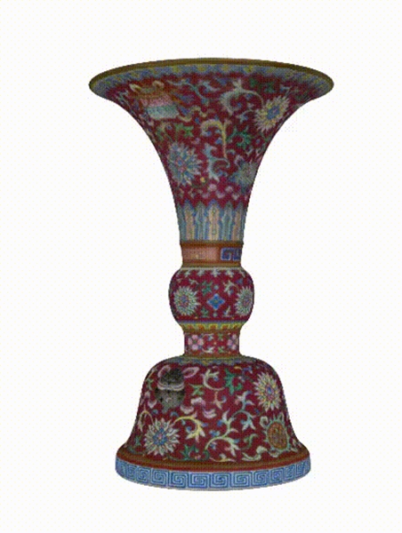 花觚源自于作为酒器的觚,觚始见于新石器时代陶器,商、周时期流行青铜觚。宋代开始烧制仿青铜觚的瓷质觚,其后流行于元、明、清三代,用于插花、陈设和供器之用,所以被称为“花觚”。这件粉彩番莲八吉祥纹花觚主体纹饰乃八吉祥纹,据此推断,它应是五供之一。五供由香炉一、花觚二、烛台二组成。清代有瓷、玉、珐琅、铜、锡等材质花觚。