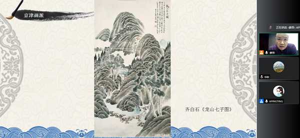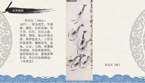 京津画派:承接上期内容,本次讲座重点介绍了京津画派代表人物——齐白石。齐白石(1864—1957),原名纯芝,字渭青,濒生,后改名璜,号兰亭,白石、白石山翁、老萍、饿臾、借山吟馆主者、寄萍堂老人、三百石印富翁等。擅画花鸟、虫鱼、山水、人物。笔墨雄浑滋润,色彩浓艳明快,造形简练生动,意境淳厚朴实。