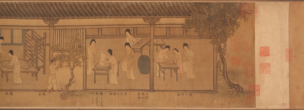 南宋《蚕织图》全长1100厘米,画心纵27.5厘米、横518厘米,跋横460厘米,画作场景宏大,以中国农历的24节气为单元,共绘有24幅小图,描绘了我国古代种桑、养蚕、织布等与蚕织相关的劳作过程。由于其形象生动、细腻传神地描绘了劳动者蚕织的场景和详细的生产过程,而起到了普及知识、推广织作技术、促进社会生产力发展的巨大作用,使其本身也成为极其珍贵的艺术瑰宝,传世之作。