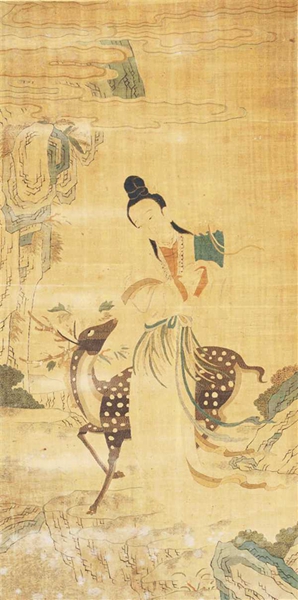 缂丝麻姑像中堂,清,纵110厘米、横56厘米。画中麻姑和神鹿站于悬崖边,身侧峭壁,天上流云。麻姑年约十八九,顶中作髻,余发垂垂,手捧装着寿酒的宝瓶,麻姑整体形象柔美飘逸,麻姑身后的神鹿回首仰望麻姑。