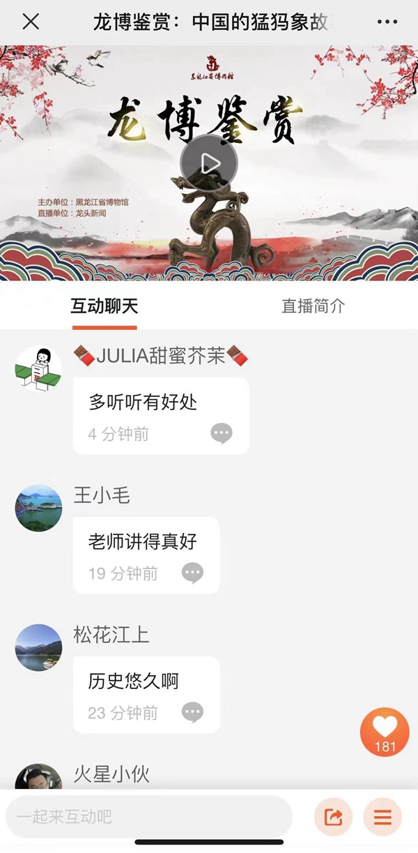 猛犸象化石等丰富的不可再生的自然资源,不仅仅是我们的物质财富,更是一笔非常宝贵的精神财富。黑龙江省博物馆化石藏品种类丰富,“龙博鉴赏”的直播平台,让沉寂万年的化石“活起来”,让公众有机会聆听历史回音,了解远古生命演化的传奇。