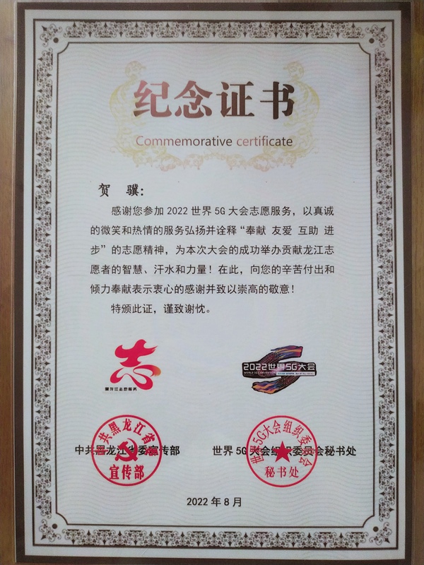 8月12日,2022世界5G大会已圆满落幕,对于这次大会的志愿服务经历贺骥表示:“很荣幸参与到本届大会的志愿服务工作中,虽然有时会连续工作近12个小时,但是为保障5G大会顺利进行,再苦再累都是值得的”。贺骥弘扬了“奉献、友爱、互助、进步”的志愿服务精神,践行了志愿服务宗旨、展现了龙江志愿者风采,以热情、细致、专业、高效的服务圆满完成了2022世界5G大会志愿服务工作。虽然本次志愿服务圆满结束,但龙博志愿服务精神将始终延续,龙博志愿者将以更饱满的热情、更优质的服务和更佳的精神状态,投入到今后的工作中,为建设现代化新龙江争光添彩。