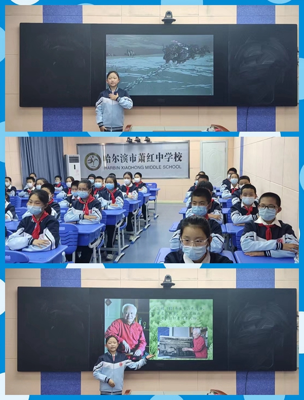 由中宣部志愿者服务促进中心、国家文物局博物馆与社会文物司主办,中国博物馆协会承办,中国博物馆协会志愿者工作委员会协办的“喜迎二十大 强国复兴有我——青少年中华文物我来讲”博物馆志愿服务项目9月份走进萧红中学。来自六年级五班的郝梓涵带领同学们共同欣赏北大荒版画作品《第一道脚印》。