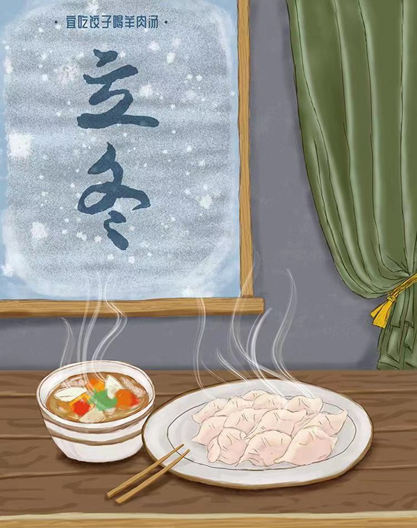 在我国南方地区,人们会吃些滋阴补阳,热量较高的食物,如鸡鸭鱼肉等;在山东地区,立冬时节有喝羊肉汤的习俗,在寒冷的天气,喝一碗热气腾腾的羊肉汤,绝对是一种享受。在我国北方地区,人们爱吃饺子,饺子是来源于“交子之时”的说法,立冬是秋冬季节之交,故“交子”之时的饺子不能不吃。庆祝立冬的方式现在也有了创新,在哈尔滨,立冬之日,黑龙江省冬泳协会的健儿横渡松花江,以这种方式迎接冬天的到来。