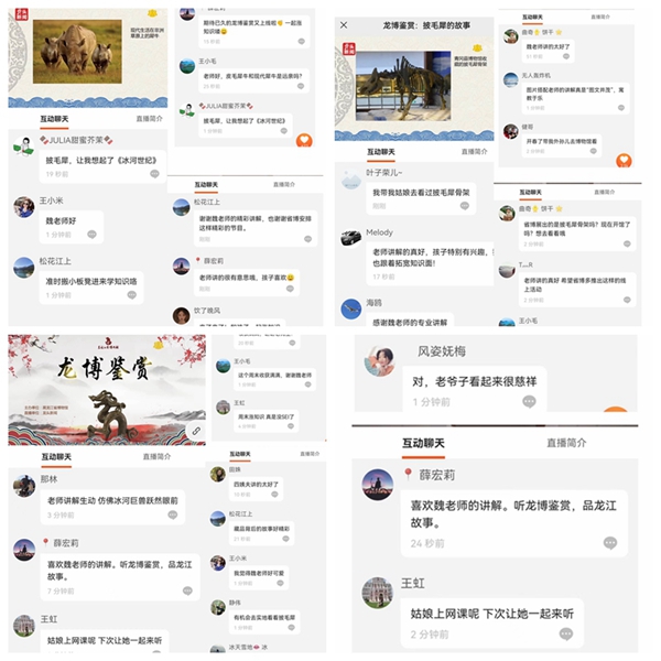 “老师讲的很有意思,孩子喜欢”“期待已久的龙博鉴赏又上线了!”“披毛犀,让我想起了《冰河世纪》”“藏品背后的故事好精彩”“有机会去实地看看披毛犀”……伴随着“龙博鉴赏”的走红,“镇馆之宝”、艺术画作、历史文物等等,越来越多的中华优秀传统文化走进大众视野,文物背后的龙江故事受到了观众的关注与喜爱,省博物馆在跨界融合发展中焕发出新的生机活力。