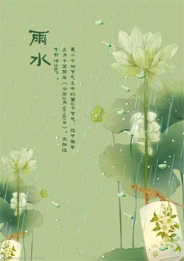 雨水,是二十四节气中的第2个节气。每年的2月18日至20日其中的一天。此时,太阳到达黄经330°。雨水之后开始降雨,雨量渐增,气温回升,冰雪融化,春风拂面,湿润的空气,温和的阳光和萧萧细雨的日子开始来临。