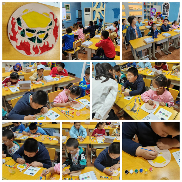课程的后半段,老师根据主题,先介绍了黑龙江省博物馆收藏的金代文物六耳大铜锅,随后在艺术创作环节中,指导同学们利用素材包,发挥想象,着手在陶瓷板上进行绘画,同学们挥舞画笔,创作出了一幅幅创意十足风格鲜明的作品。
