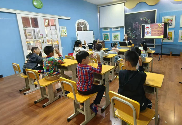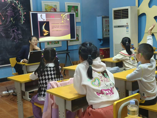 “‘锦瑟无端五十弦,一弦一柱思华年。’‘羌笛何须怨杨柳,春风不度玉门关。’两句诗词中的‘锦瑟’和‘羌笛’分别指什么?哪种是中国传统乐器?”老师由诗词为切入点,带领孩子们走入乐器的世界,为大家详细地讲解了箫、埙、瑟、提琴等中外乐器的历史背景、声音特点、制作材料、演奏方式等。