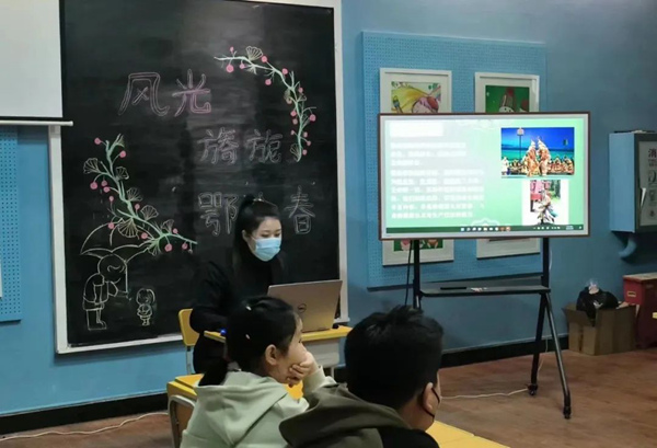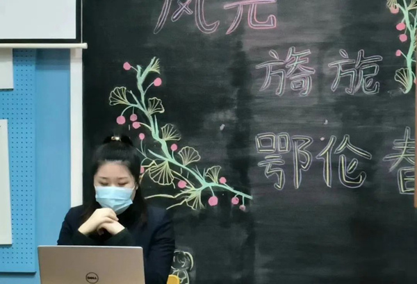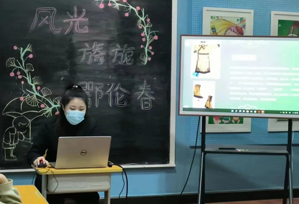 随着课程的深入,老师向同学们介绍了鄂伦春族的起源、人口分布、礼仪民俗、传统艺术等知识。鄂伦春族是个能歌善舞的民族,通过老师播放的视频短片,同学们深入了解了鄂伦春族歌舞的特点,感受来自山林草原的文化气息,对鄂伦春风物有了更直观的认识。