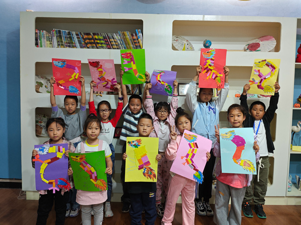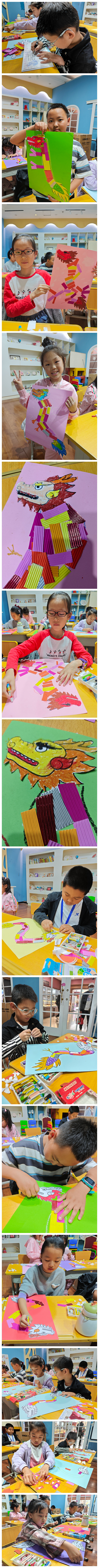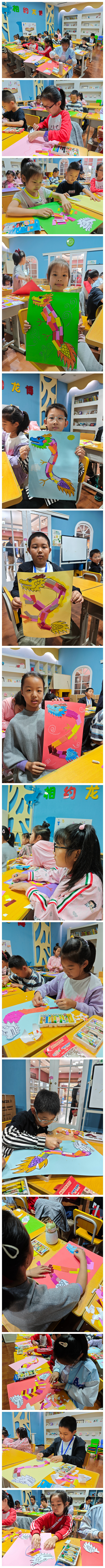 课堂上,同学们对黑龙江的历史有了更深一步的了解。通过对铜坐龙造型和纹饰的研究探讨,孩子们得到许多有益的启示,只有将传统与现代巧妙结合,才可能创作出具有中华文化魅力的艺术精品。随后,在老师的带领下,同学们细心观察它的独特造型,用蜡笔和卡纸绘制粘贴出一幅幅各具特色栩栩如生的画作,在体验手工制作乐趣的同时,加深了对金源文化的理解。