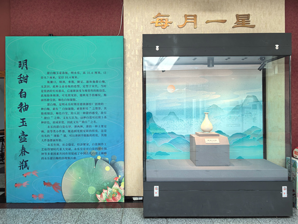 瓶撇口,细颈,垂腹,圈足。通体施甜白釉,无款识。此种玉壶春瓶的造型,定型于宋代,当时是装酒的实用器具,后逐渐演变为观赏性的陈设瓷。此瓶胎体极薄,可光照见影,能映见手指螺纹,釉面恬静莹润,釉色白如凝脂。